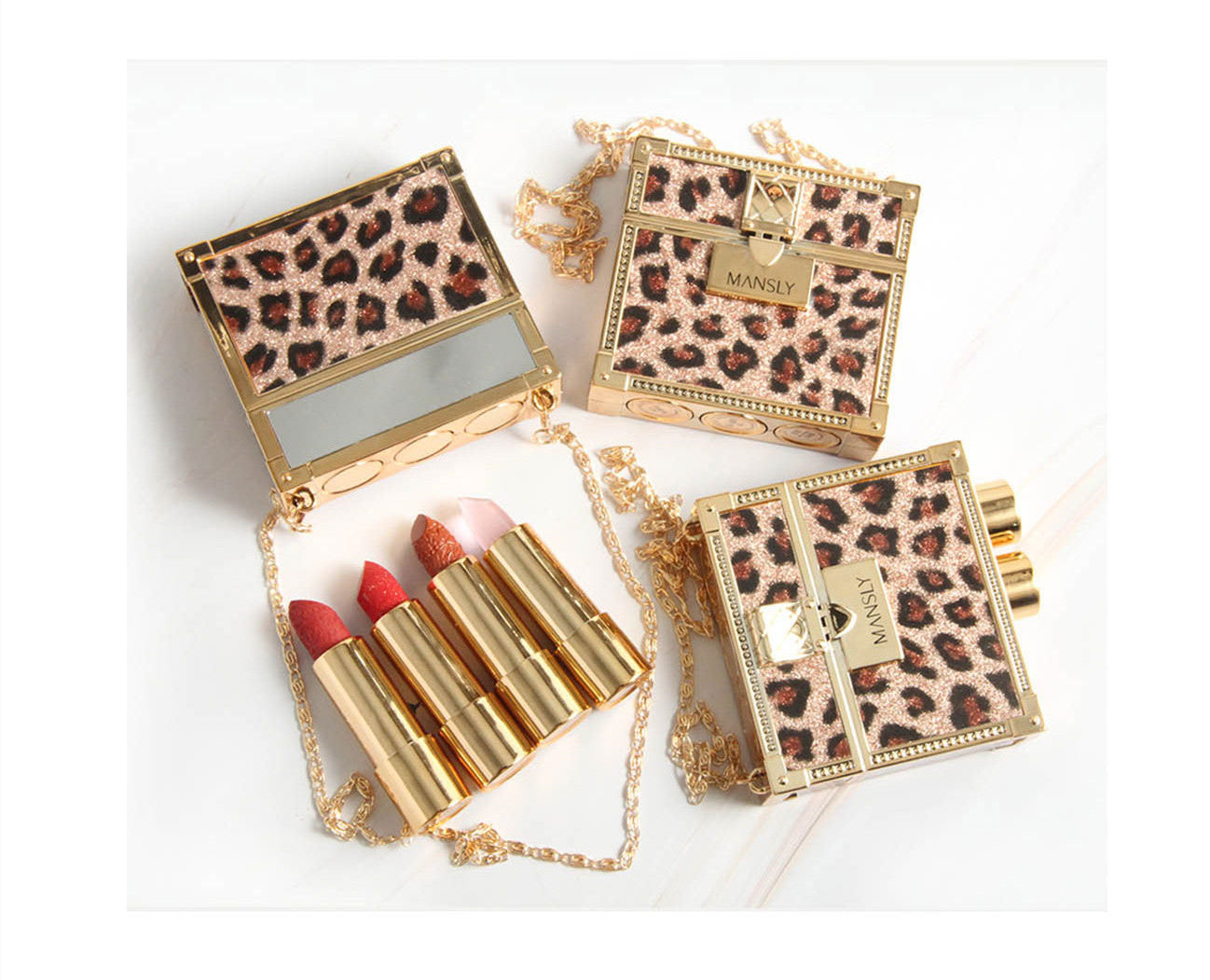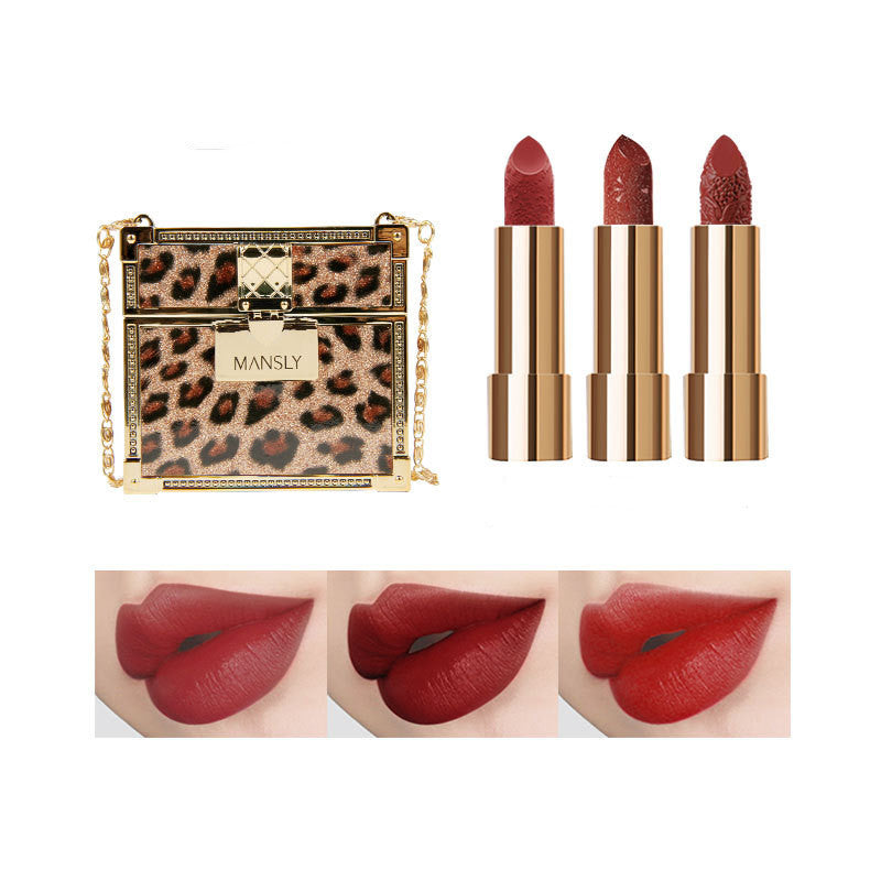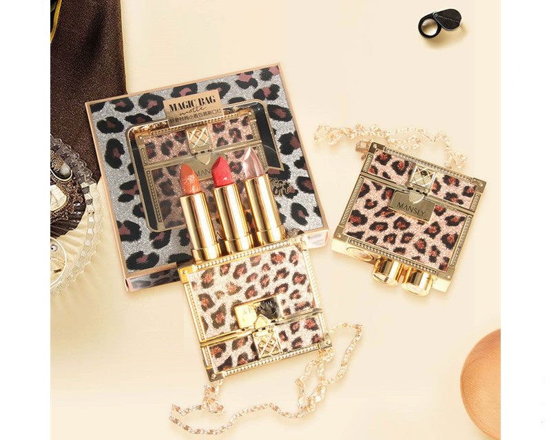 Fashion Small Sachet Mousse Lipstick Leopard Print Chain With Small Round Mirror Set