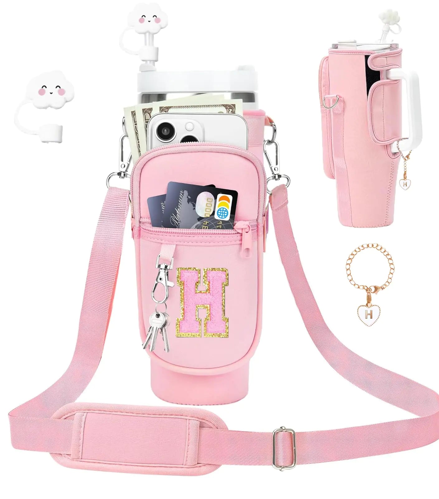 [Personalized A-Z Letter Embroidery with Gift Bag: Personalized bag for stanley cup 40 oz with handle featuring unique embroidered Letter designs from A to Z. Each stanley cup 40 oz bag is not just an accessory but a statement of individuality. Perfect for adding a personal touch to your style or as a thoughtful gift for wife girlfriend mother daughter friends who are stanley fans with our attached gift bag Perfect for Stanley 40 oz Tumbler with Handle: Pink Stanley cup holder is specially designed for stanley 40 oz tumbler with handle.It will be a bit bigger if you use this bag for stanley cup 30oz Premium Neoprene Material: Crafted from high-quality Neoprene material this bag for stanley 40 oz tumbler provides unbeatable protection against daily scratches and annoying noice which features durability and waterproof. Elevate your life level with our well-made bag for 40 oz stanley cup with handle Bouns with Straw Cover Spill Stopper Letter Charm: In addition to the stanley cup holder each package comes with essential stanley cup accessories 40 oz such as stanley straw topper spill stopper and stanley charms for handles ensuring you have everything you need for on-the-go hydration. No need to worry about the leak issue and prevent the stanley straw from being contaminated by dust in the air "Meet Various Occasions: Experience the ultimate versatility with our stanley cup holder with strap ideal for every occasion such as yoga class watch sport games walking dog tour hiking ect With a Gift bag in the package this pink bag for stanley cup 40 oz is also a great gift for those special moments such as Birthday Valentines Day Mothers Day Christmas and more"]